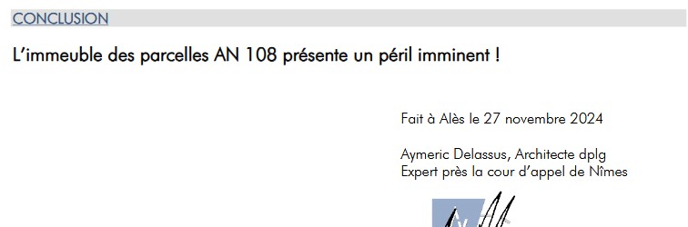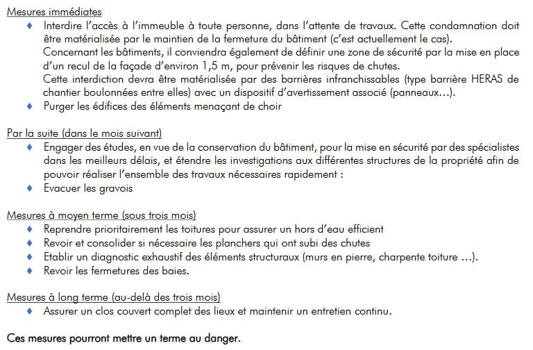 « Le rapport d’expertise judiciaire est catĂ©gorique : il conclut officiellement Ă un « PÉRIL IMMINENT ». Pour faire cesser ce danger, l’expert a consignĂ© des prescriptions d’urgence strictes dont les dĂ©lais d’exĂ©cution sont les suivants : »